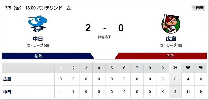 中日は初回、1死一二塁からカリステが適時打を放ち、幸先良く先制に成功する。続く2回裏には、ロドリゲスの適時打で1点を奪い、リードを広げた。投げては、先発・高橋宏が9回4安打無失点の快投。今季初完封で5勝目を挙げた。敗れた広島は、先発・床田が試合をつくるも、打線が沈黙した。