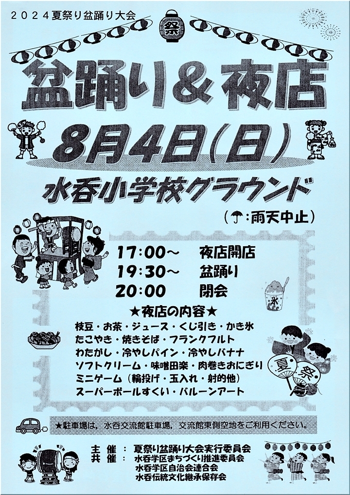 そして、我が水呑学区の夏祭り盆踊り大会≠フご案内。8/4(火)の開催ですネ。今回は、アトラクションのステージは無いのかも…