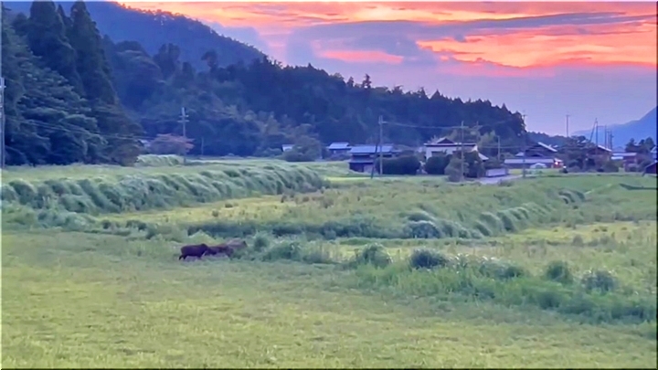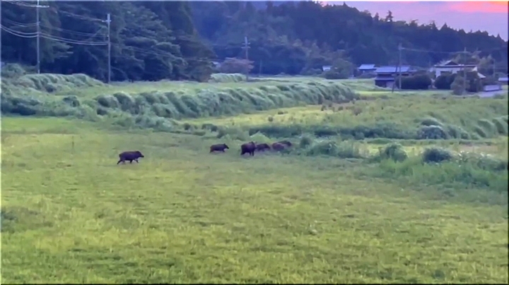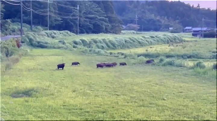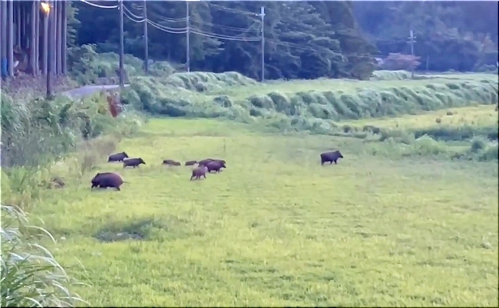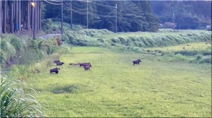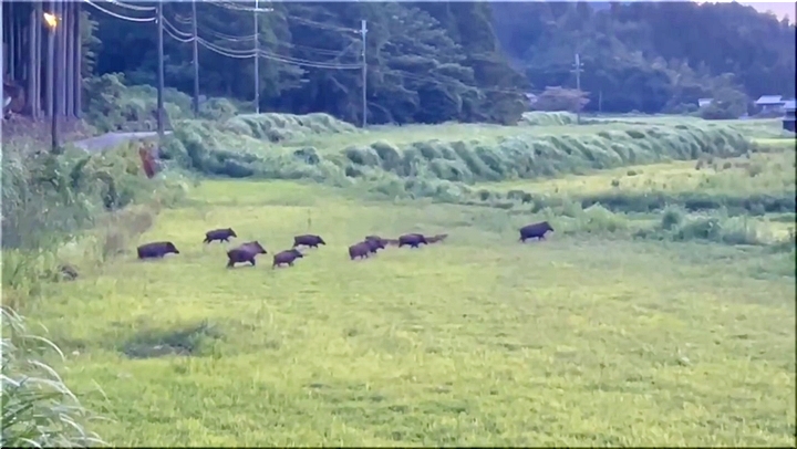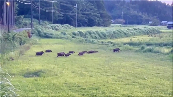 若狭町の夕暮れ時の一コマのようですけど、10頭ばかりのイノシシのファミリーが、山側から農地方向へと大移動(^-^)