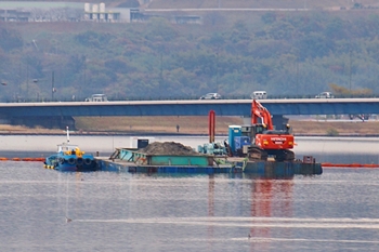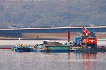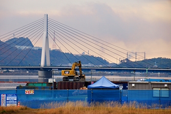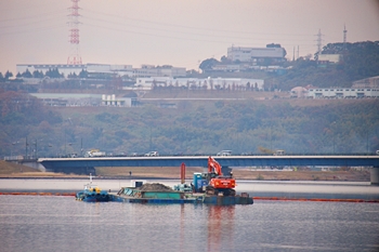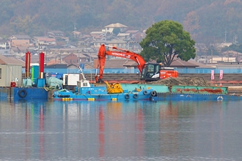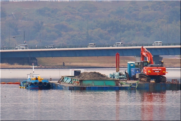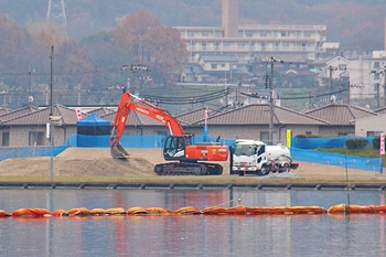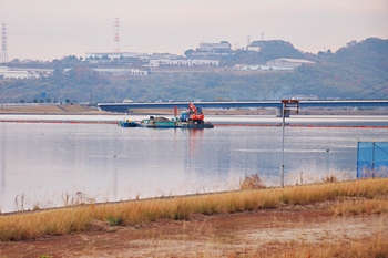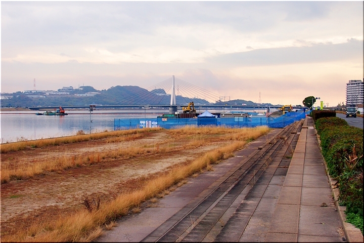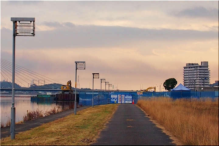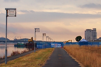 芦田川大橋〜小水呑橋間では、河道掘削工事が行われています関係で、この間の芦田川右岸の河川敷の一部が通れませんから市道を歩行です。