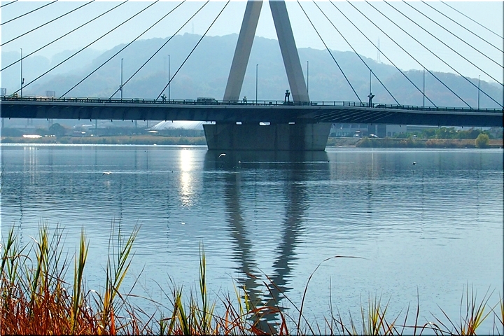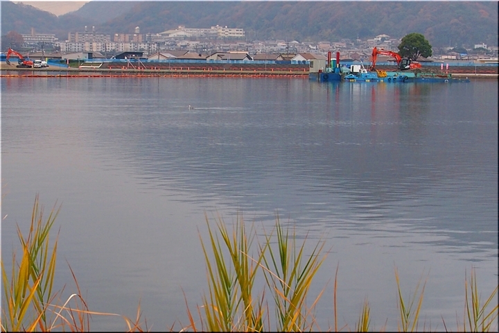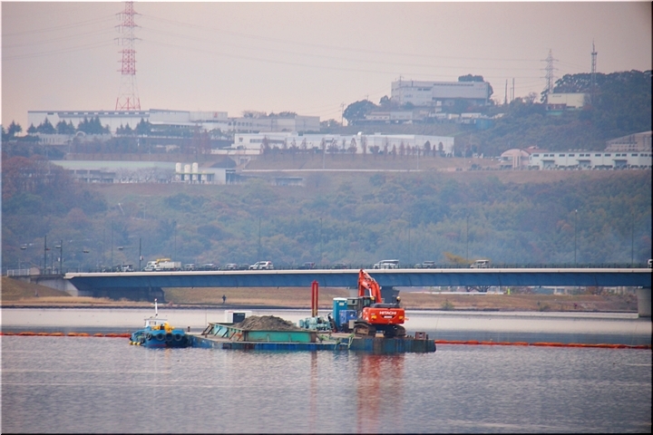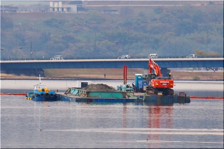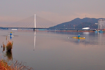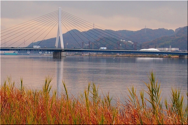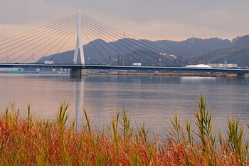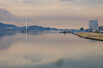 小水呑橋を渡りながら芦田川大橋主塔方向に眼を向けますと、川面が実に穏やかで、波一つ有りません。無風状態ですから、川面は鏡のように実にキレイ(^_^)v