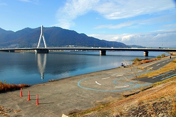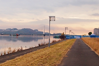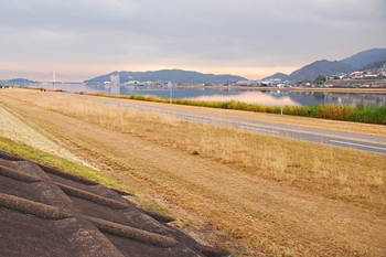 左岸の河川敷に下りますと、芦田川大橋→河口堰へ。