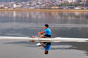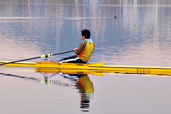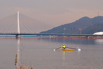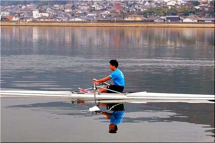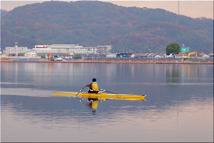暫く進みますと、今度はボート練習の方達が…いつもですと、右岸沿いで練習しておられるのですけど、河道掘削工事中で、当分、右岸沿いでは練習出来ませんから…