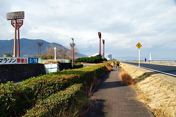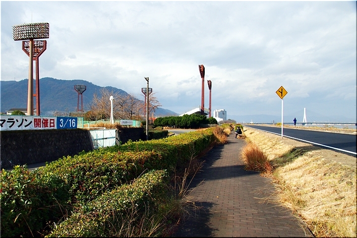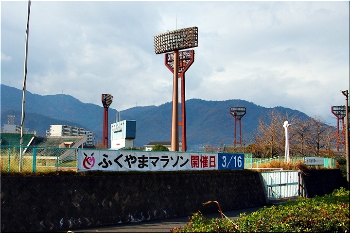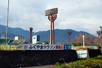 この方達を追い越して、陸上競技場辺りまでヤッて来ました。陸上競技場のフェンスには、「ふくやまマラソン開催日 3/16」の横断幕が…