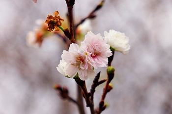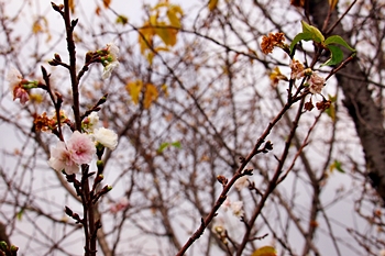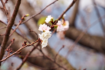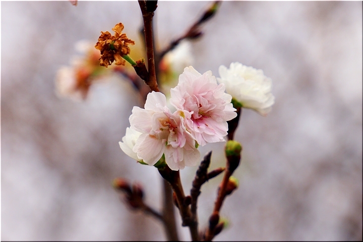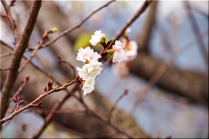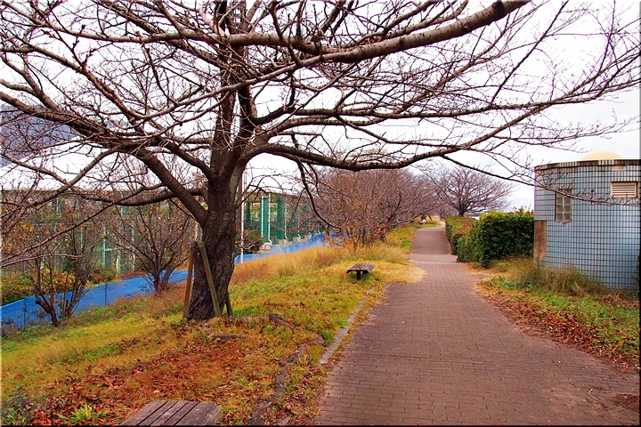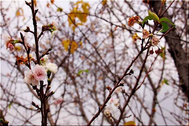 テニスコート横のウォーキングロードは、サクラ並木でありますけど、ジュウガツザクラの木も何本か存在です。近付いて確認しますと、頑張って咲いておりました。
