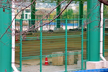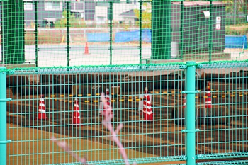 中には入れませんからフェンス越しにコートの様子を伺いますと、ふん、ふん、後は人工芝を張りますと、ほぼ終わりますようですねぇ〜