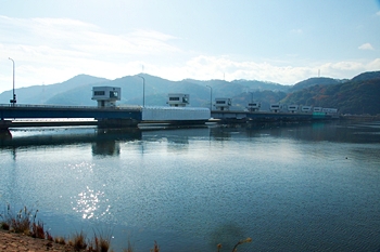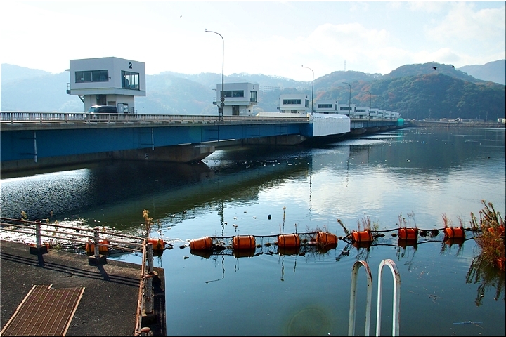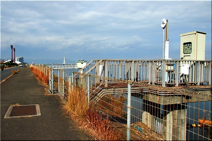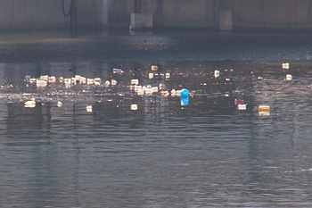 ここからは土手に上がり、道路脇の歩道を河口堰へと歩行です。河口堰の手前辺りの川面がキラキラ輝いていますけど、カモsanにしては少し違うような…ですが、結構な数ですからカモsanだろうとズームを効かせて画像に納めてみますと、ペットボトル等の容器でした(^-^;