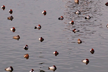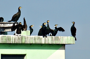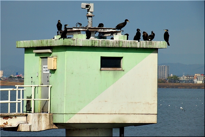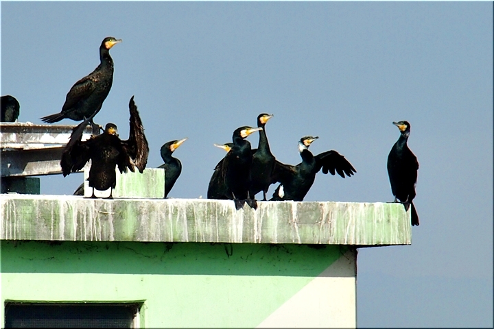 遠くから見ますと、一見、カラスと間違いそうですけど、今度はカワウ≠フ皆さんが休息中でありました。エサであります魚類を穫り終え、満腹状態での休息?…それとも、カモsan達がジャマで漁獲活動が出来ませんのかも…さて、どぅなんでしょうねぇ〜
