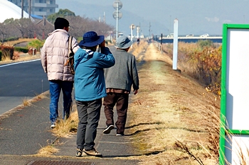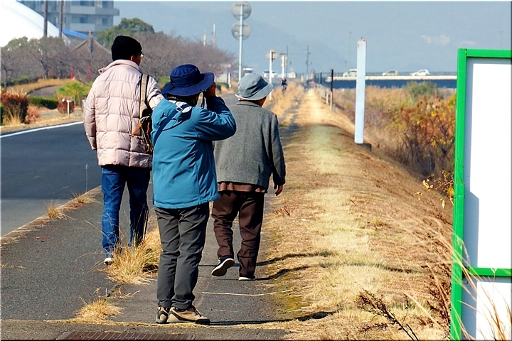 前方に眼を移しますと、いつの間にか三名の方達がウォーキングです。その内のお一人は、何にカメラを向けておられますのでしょうねぇ〜カワウでも無さそうですし(^-^)