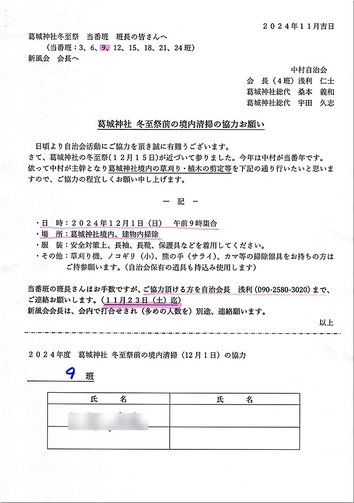 今年は、八幡神社例祭・葛城神社冬至祭等の当番班に当たっていますので、12/15・前夜祭∞12/15・当日祭≠ノは参加しませんから、境内清掃の方に参加となりましたGONsanです。