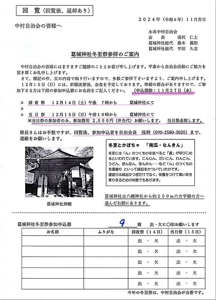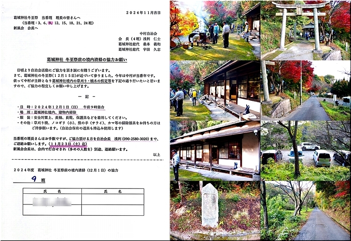 この葛城神社≠ヘ、西自治会に存在しますけど、従来より中村自治会≠ニ西自治会≠ェ1年毎の交替で維持・管理して来ておりまして、今年度は中村自治会が当番年。