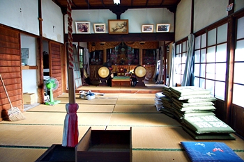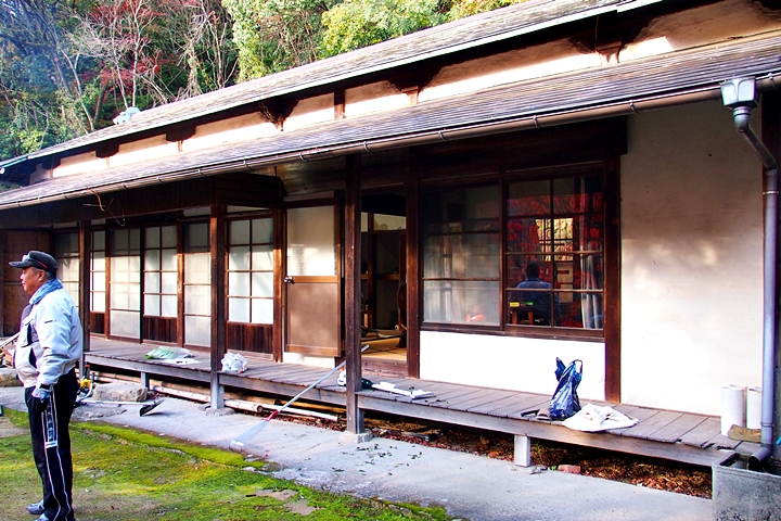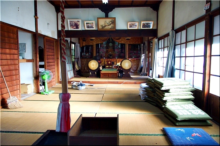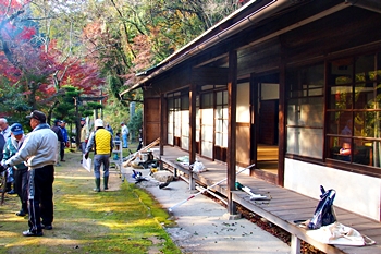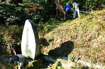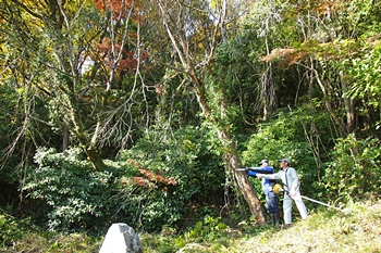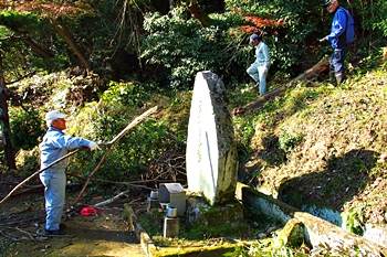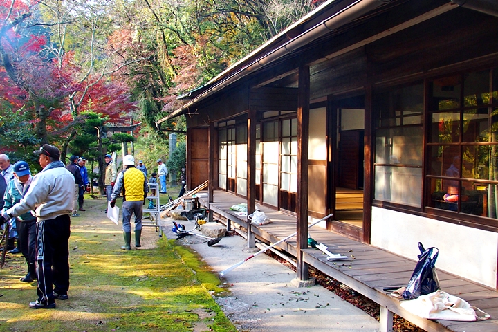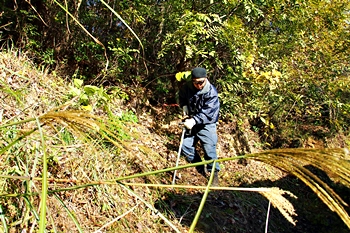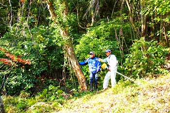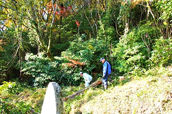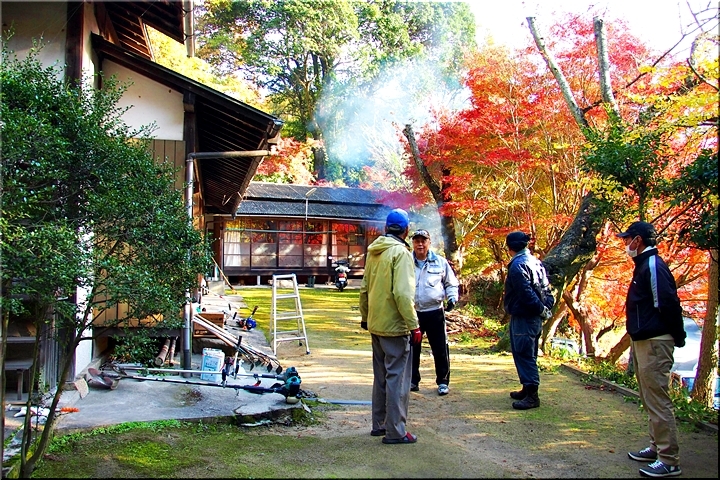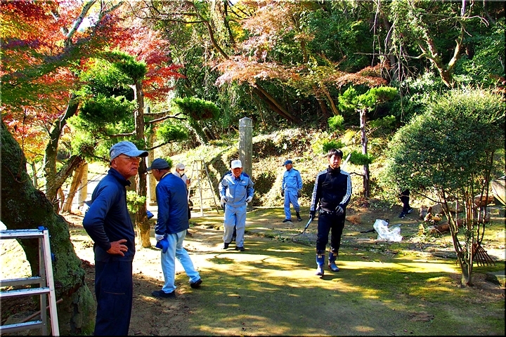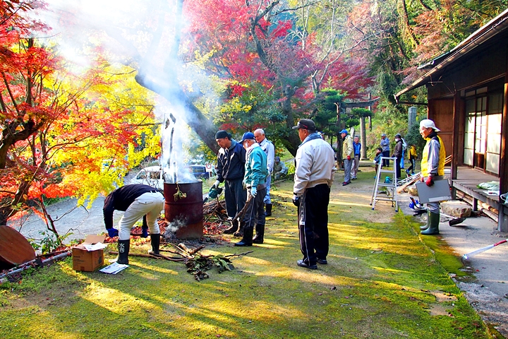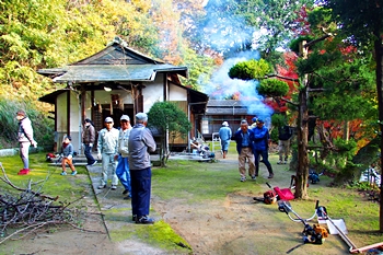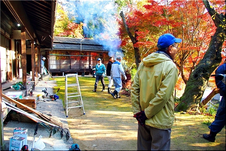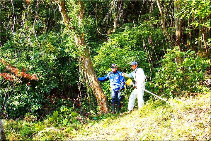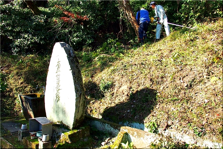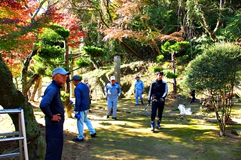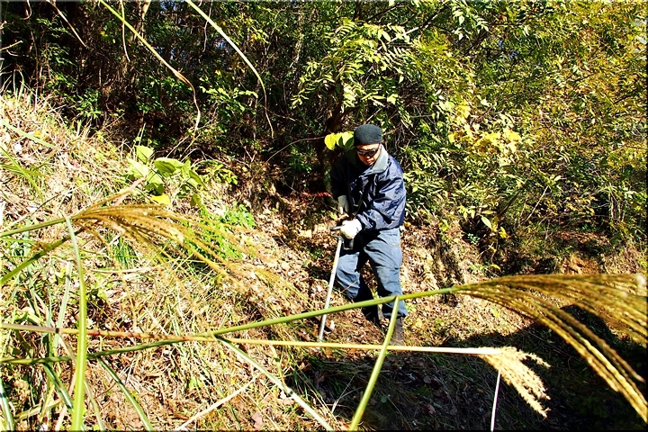 山側の斜面を草刈り機で3名の方が刈り取りしておられますから、GONsanはこの方々の刈り取られたのを境内に落とし、これを集めます作業を(^-^)