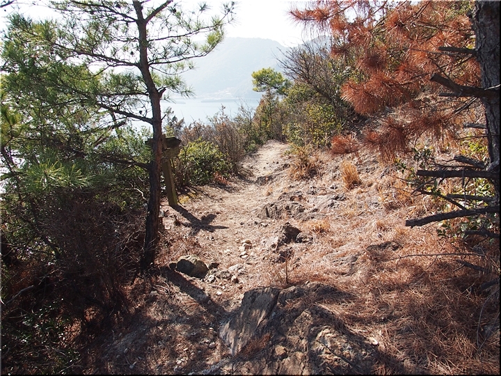 ここには道標も設置され、直進しますと〝阿伏兎観音〟方向で、右折し山に上がって行きますと〝尾根歩き遊歩道・遊歩道西口方面〟となりますけど、直進して〝阿伏兎観音〟方向に進みたいと思います。