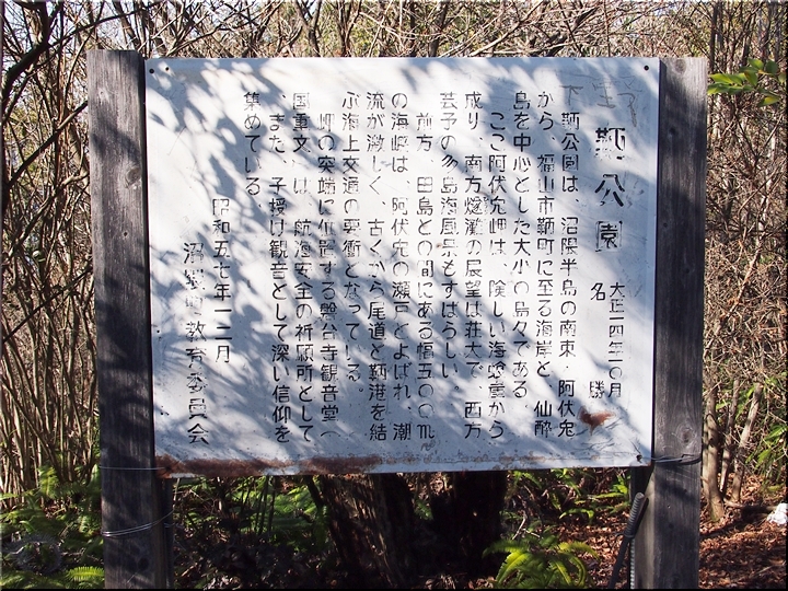 ここ阿伏兎岬は、険しい海蜋崖から成り、南方燧灘(ひうちなだ)の展望は莊大で、西方芸予の多島海風景もすばらしい。