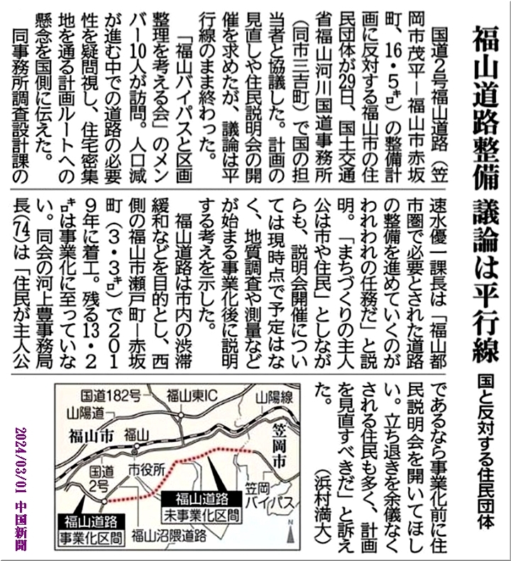 …と、この三つの道路なんですけど、奇しくも3/1の中国新聞朝刊に、肝心の〝国道2号福山道路(岡山市茂平-福山市赤坂町16.5km)〟の話題が記事掲載に。