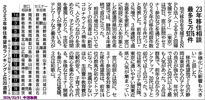 先日の朝刊記事に、「2023年移住希望地ランキング上位20道県」の発表が…ふ~ん、東京から地方への移住希望地として〝広島県〟は、結構上位なんですねぇ~