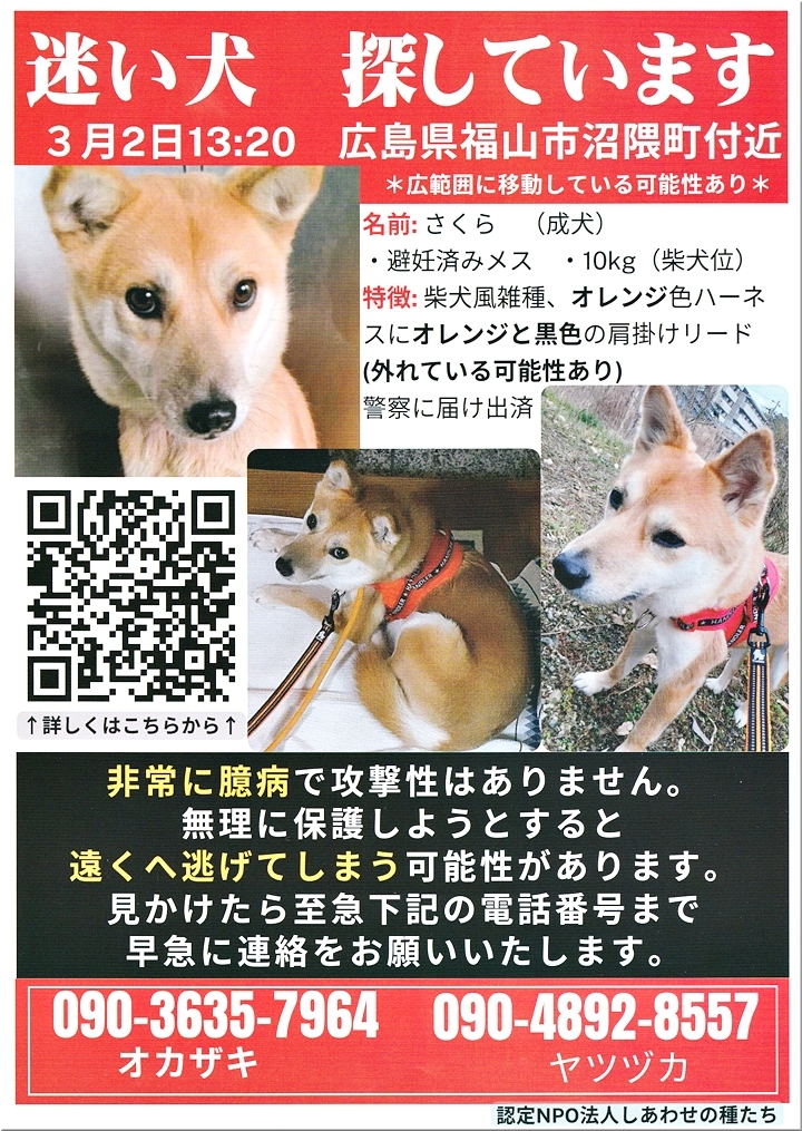 里親の飼い主sanは、この「NPO法人 しあわせの種たち」を通じて〝さくらchan〟とご縁を持たれ、行方不明となりましてからは、一緒に捜して貰っておられるのでしょうねぇ~