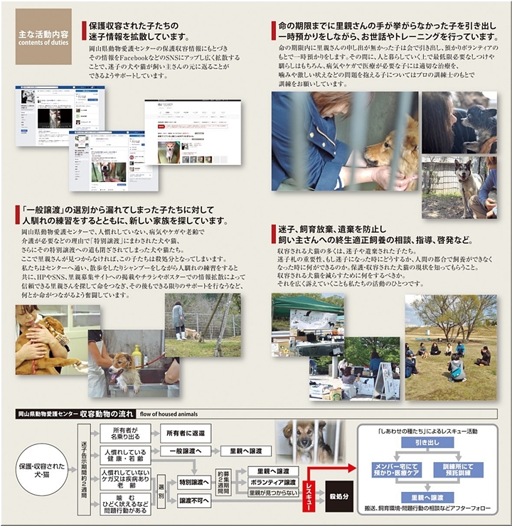 私は、そのような殺処分される愛玩動物を減らすことを目的とし、平成26年2月から個人ボランティアとしての活動を開始しました。以来、殺処分になるはずの動物を引取って人に馴れさせると同時に、里親となってくれる飼い主を探し結びつけるという活動を行ってきました。