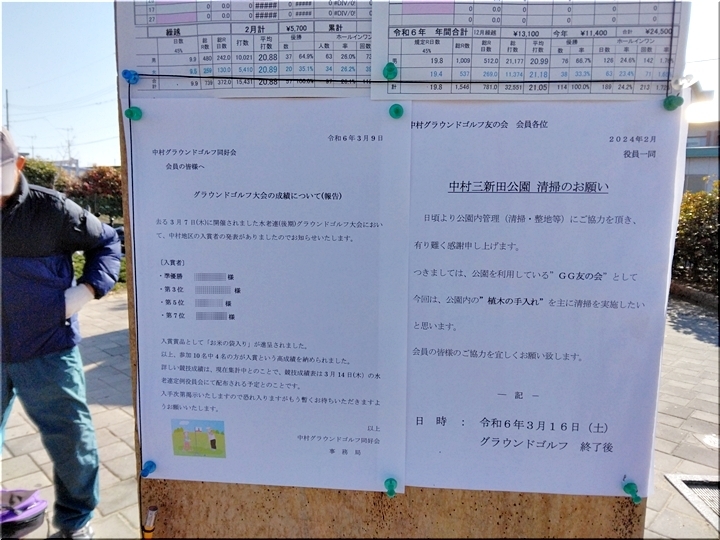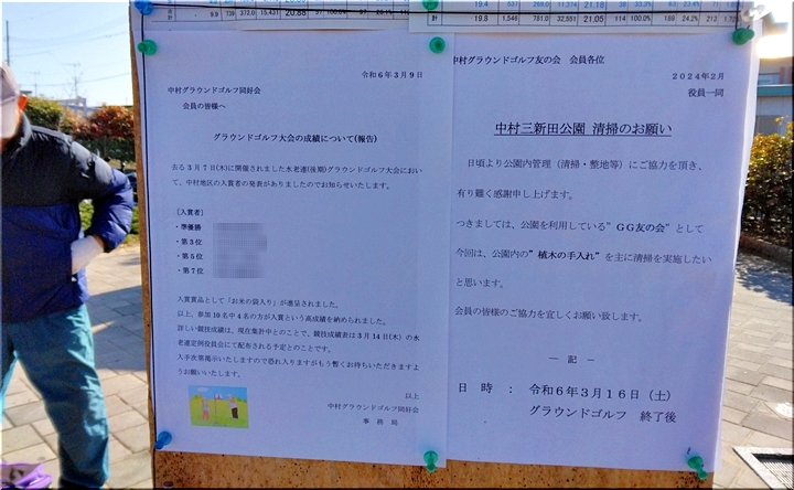 前半を終了し、掲示板に眼を向けて気付きましたけど、そぅでした、3/16(土)はGG終了後、中村三新田公園の清掃日でした。ただ、当日の朝方は所用でGGに参加出来ませんから、プレー終了間際の清掃開始前に出掛ける事となりそうです。