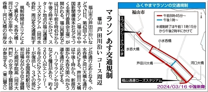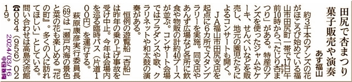 本日の中国新聞に、3/17(日)に開催の「ふくやまマラソン」&「たじり杏まつり」の記事掲載が…
