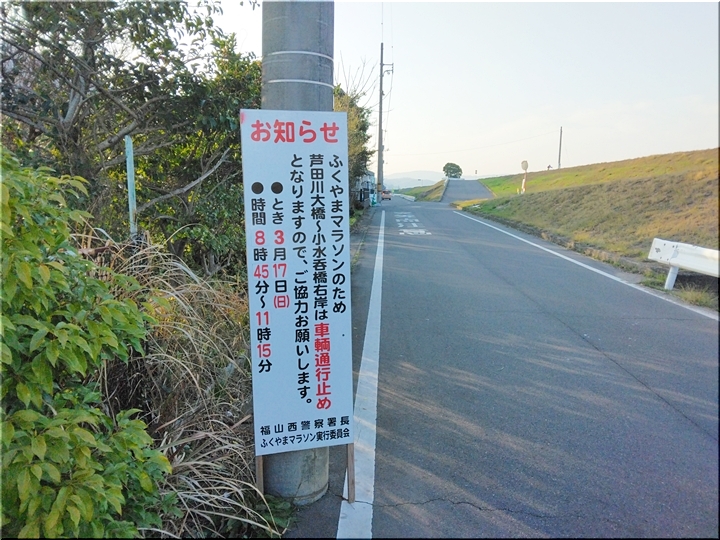 電柱に設置の「ふくやまマラソンのお知らせ」は、本日夕方近くのウォーキングからの帰路に撮りましたモノなんです。この看板に眼を向けながら、「明日は何処で観戦しようか…」と思案しながら歩いていたのですけどネ…