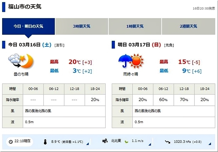 とりあえず、福山市の明日の天気を確認してみますと、ふ~ん、「雨時々晴」とは妙な天気のようですねぇ~