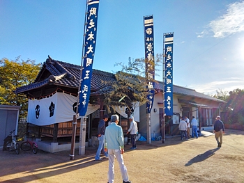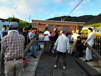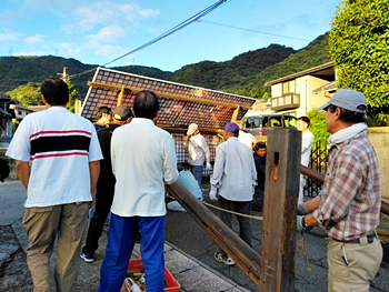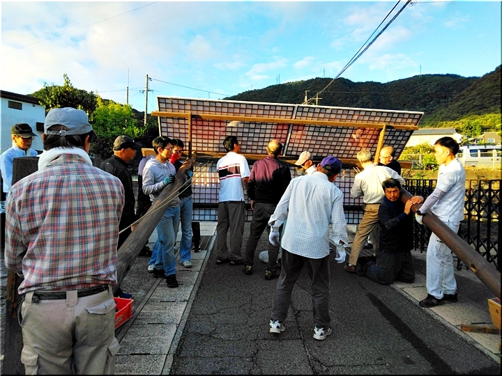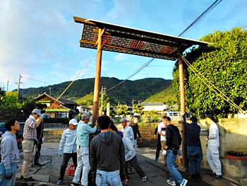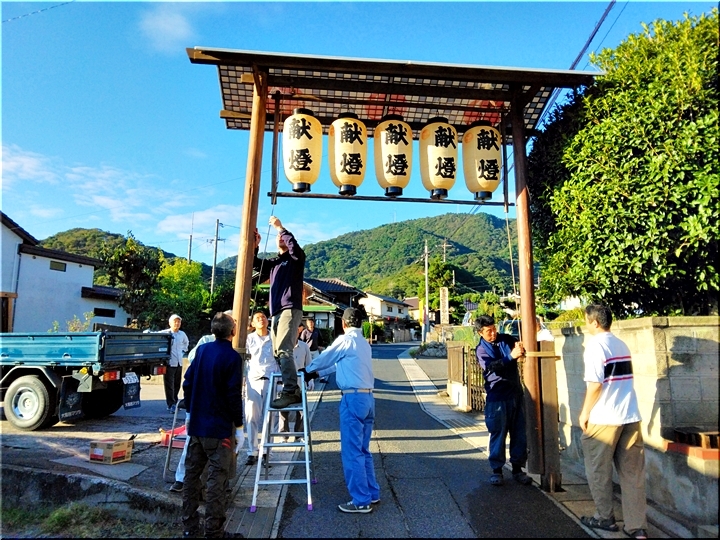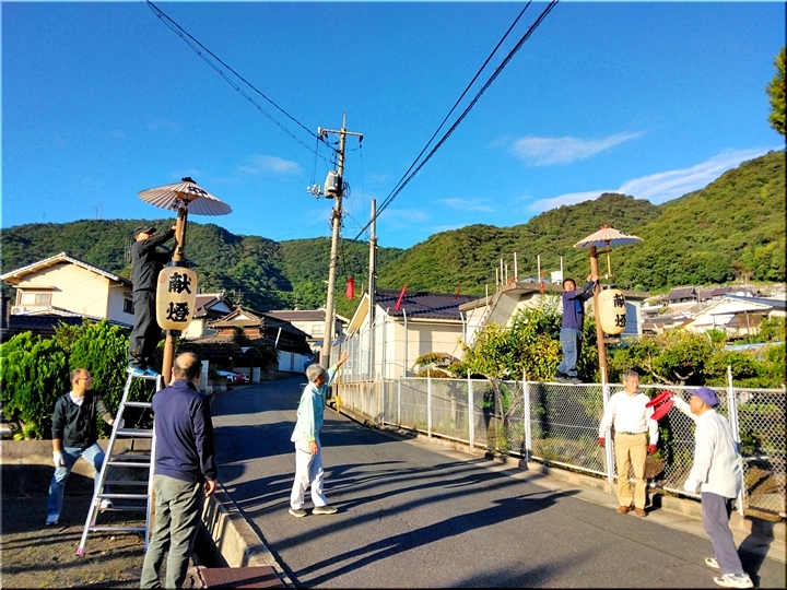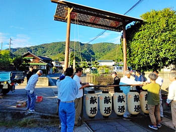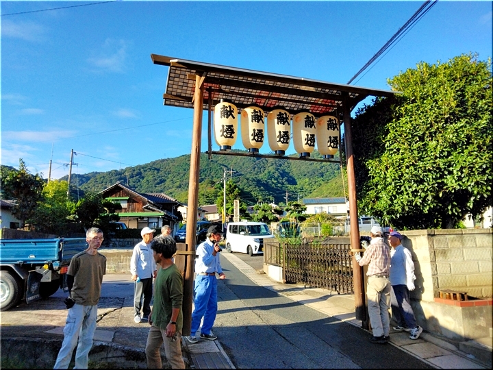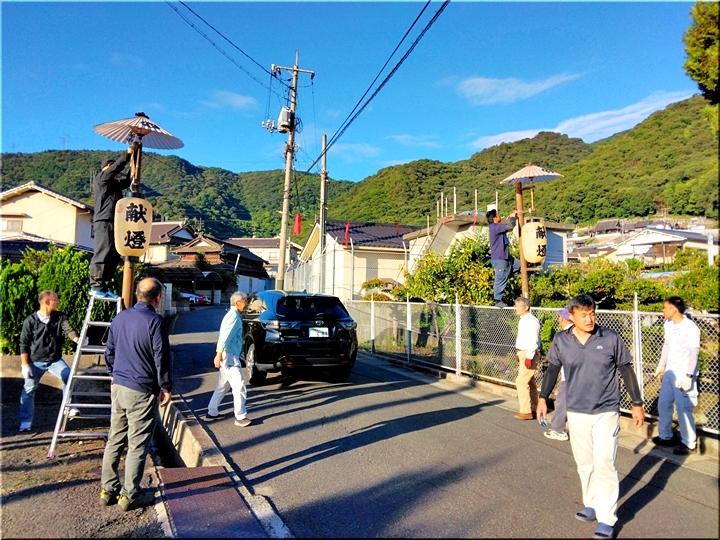 今朝は、今夜の水呑八幡神社前夜祭、明日の例祭に供えて、9/29(日)に吉廣・財之木神社≠ノ設置しました御神燈・傘提灯≠、八幡神社参道へ移設作業となりました。