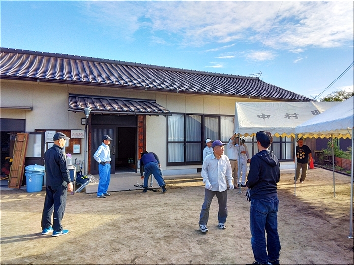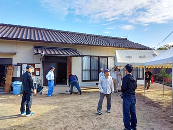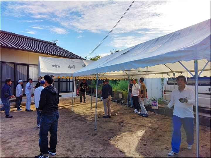 集会所にと戻ってきますと、今度は、集会所前に2基のテントを設営です。ここでも御神輿を廻しますので、接待・休息用のテントとなりますか。