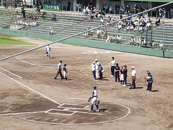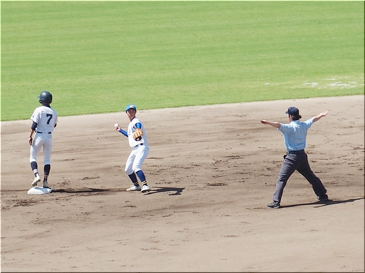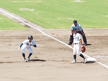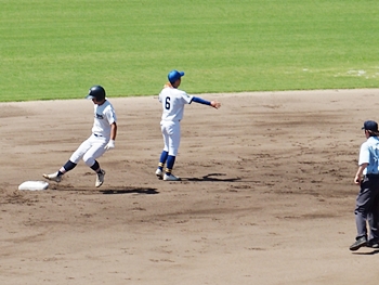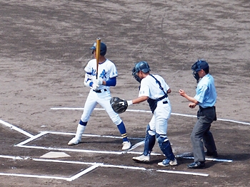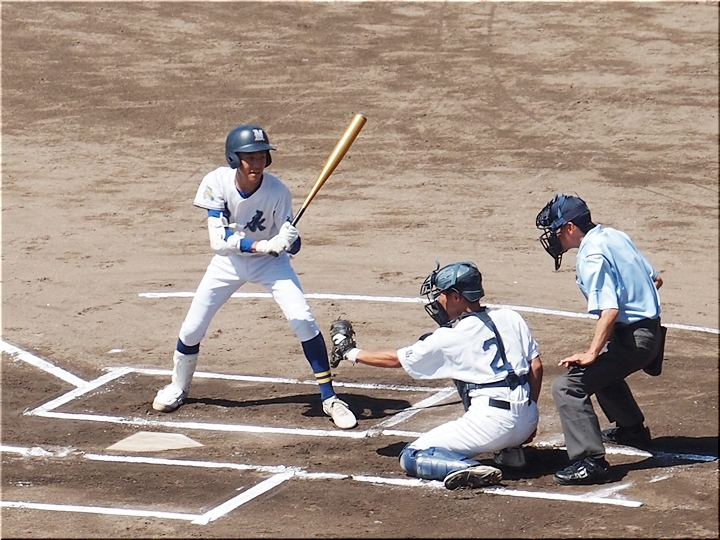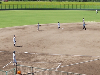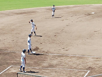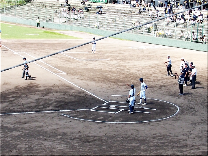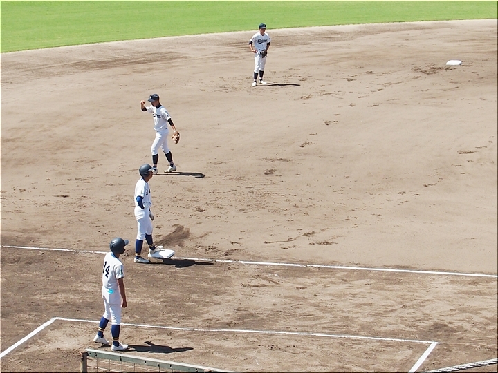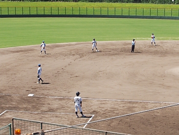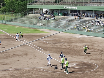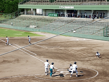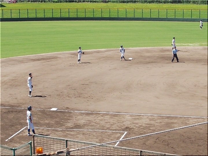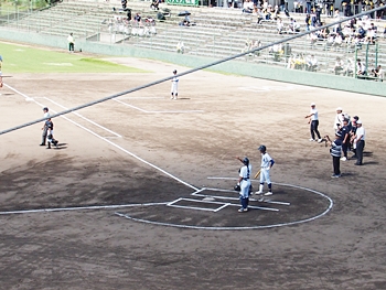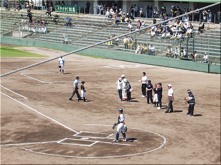 試合開始間もなく、2アウト二・三塁と先取点のチャンス到来の松永高校。ですが、続く打者が二ゴロ、アウトで先取点ならず。