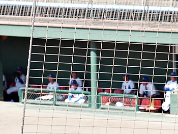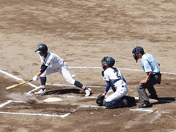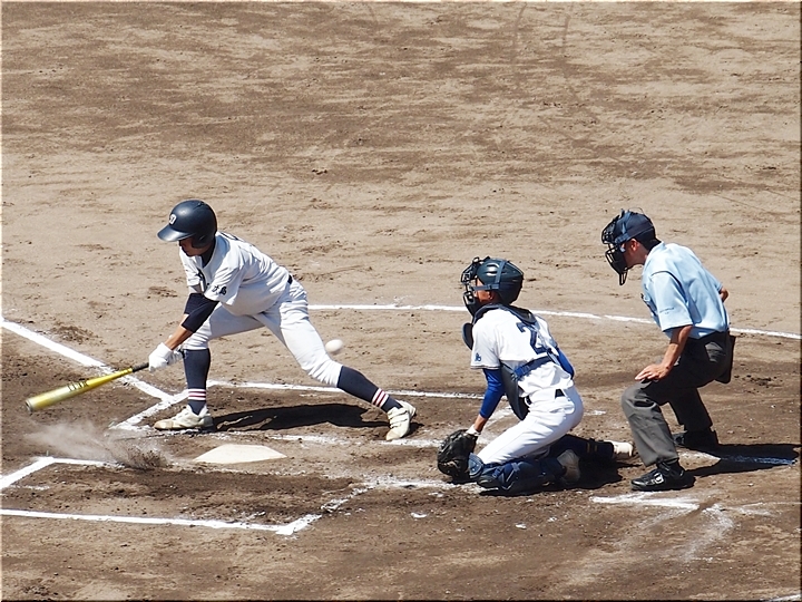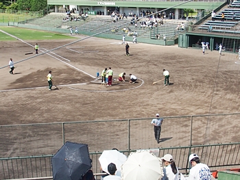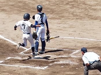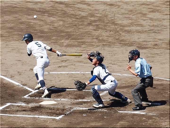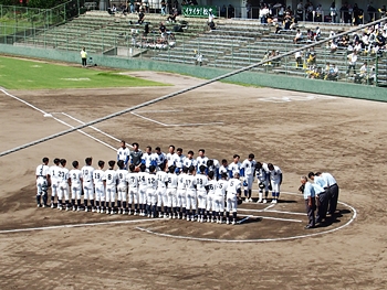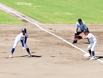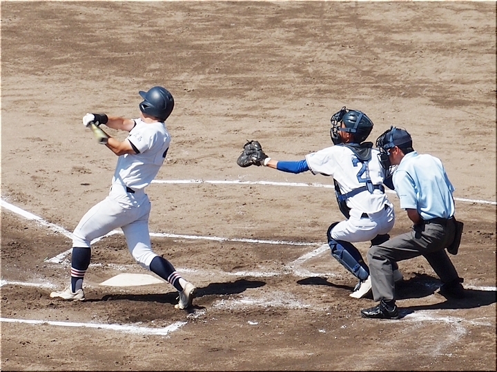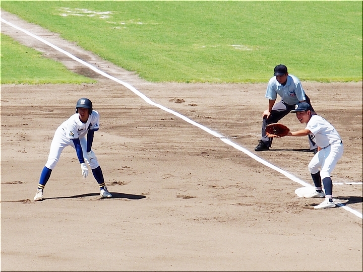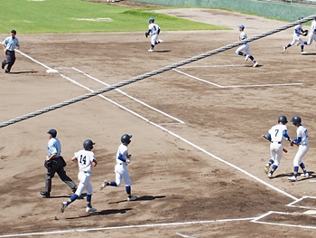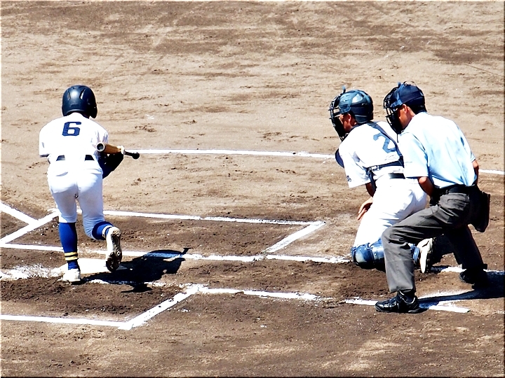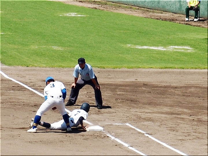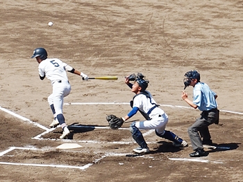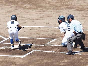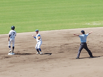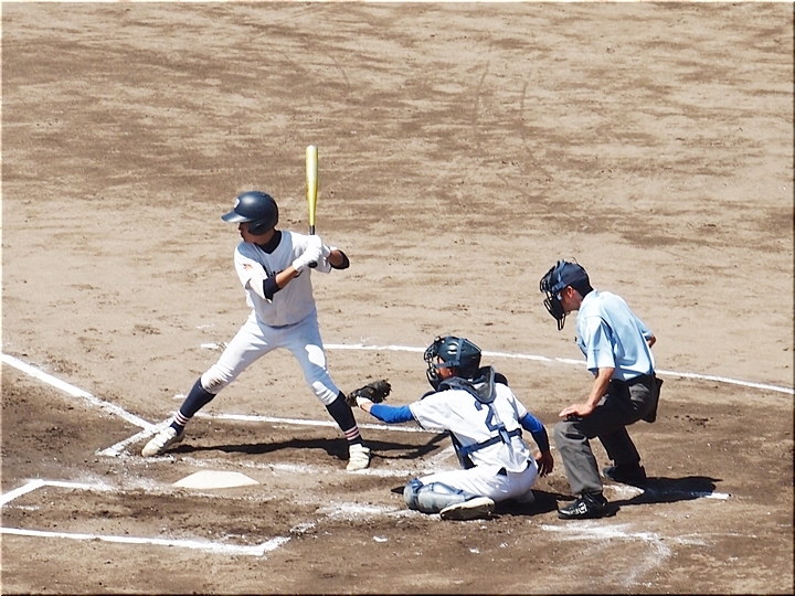 試合開始間もなく、2アウト二・三塁と先取点のチャンス到来の松永高校。ですが、続く打者が二ゴロ、アウトで先取点ならず。