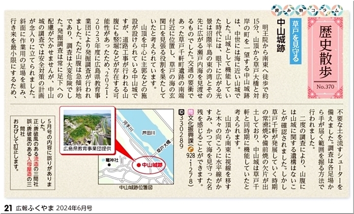 もぅ随分前となりますが、市の広報誌「広報ふくやま」6月号に中山城跡≠フ記事掲載がありました。