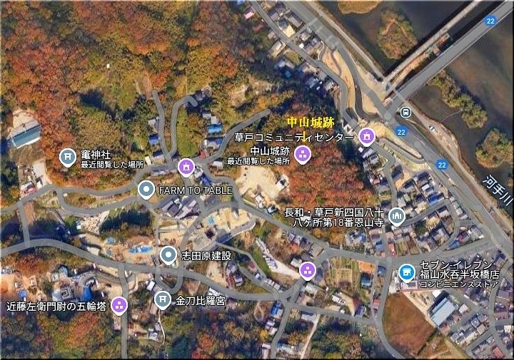 中山城は、かつては福山湾に面していた芦田川西岸の低丘陵上に位置する山城で、沼隈半島の山田荘を治めた渡辺氏の一族が居城したといわれている。