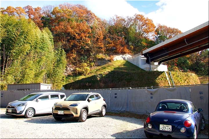 中山城跡西側の、新設された高架道路下に空地がありますから、ここに駐車。中山城跡を貫きますトンネル工事は、未だ始まってはいませんようですネ。