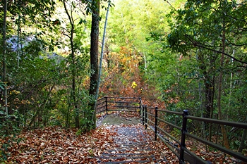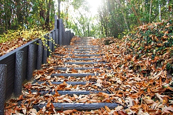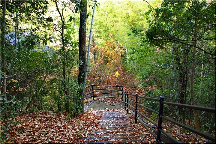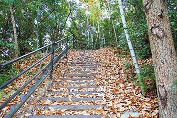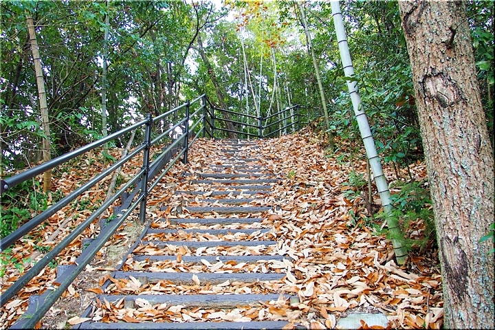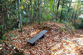 石段が無くなり落ち葉の地面を進みますと、途中にベンチが…