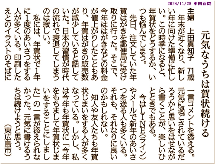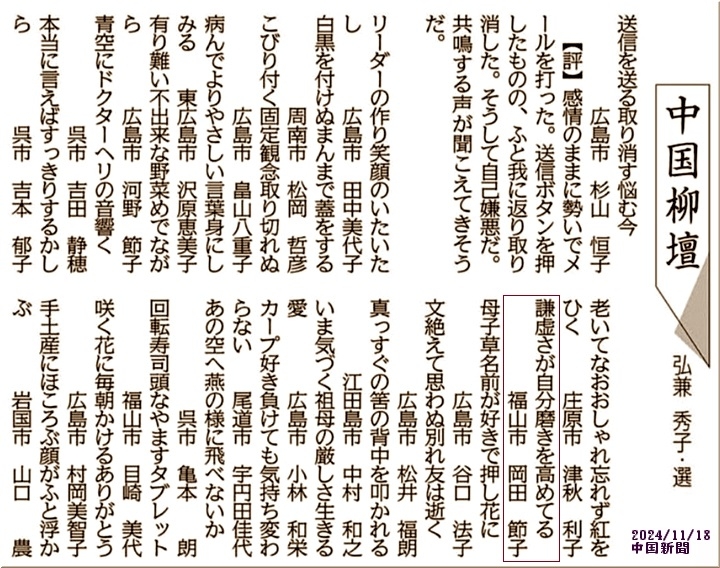暫く中国新聞読者文芸<Rーナーに従姉の投稿が無く、心配していたのですが…