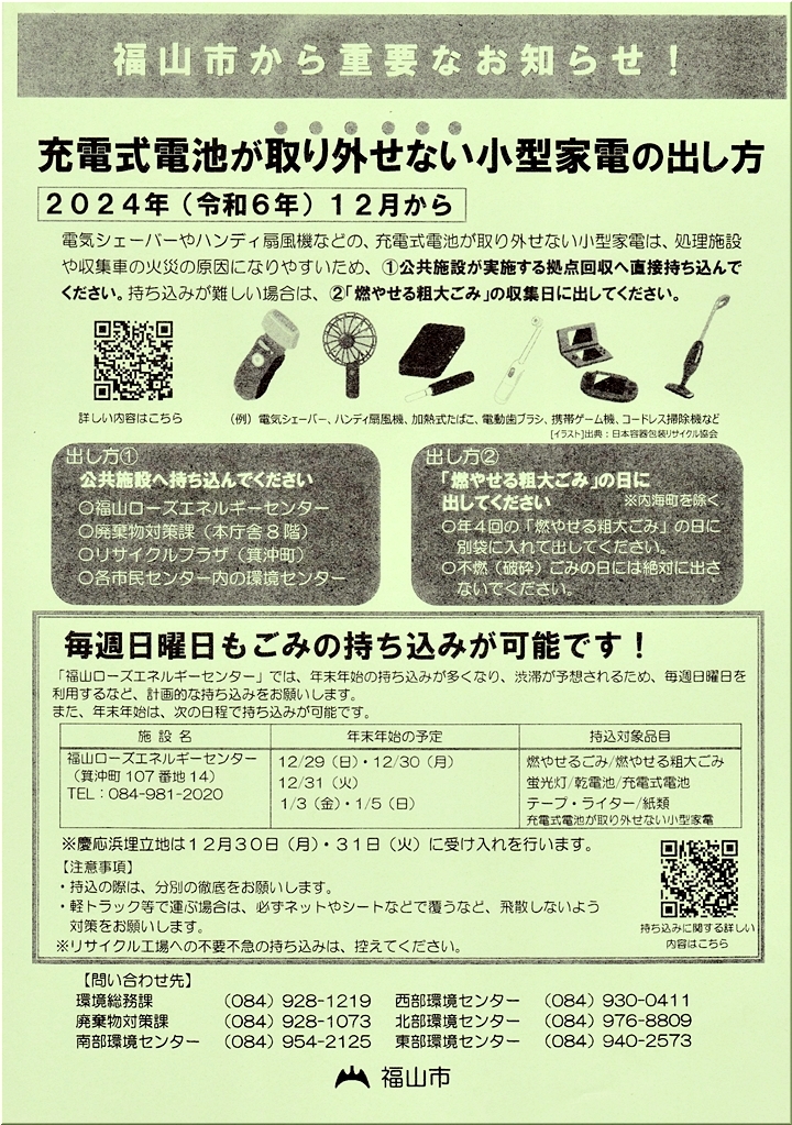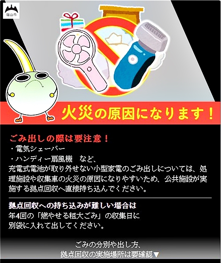 また市は、ごみ処理施設「福山ローズエネルギーセンター」(同)や市役所8階の廃棄物対策課、市内4カ所の環境センターなどに回収拠点を設けており、持ち込みも呼びかける。
