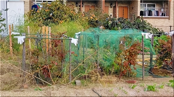 白い軍手が6組ばかり、防鳥ネットの支柱に…作業後、洗って干しているにしては数が多すぎますし…カラス等の鳥害除けとして手袋使用は見た事がありませんし…