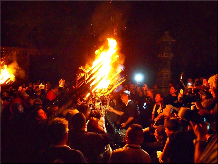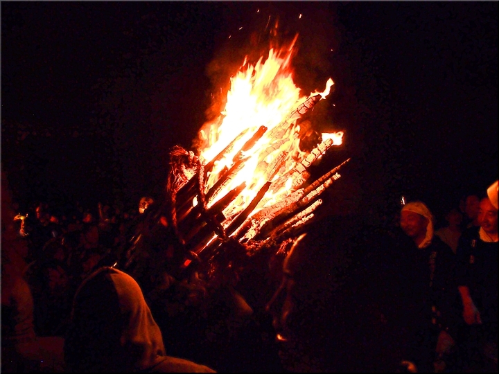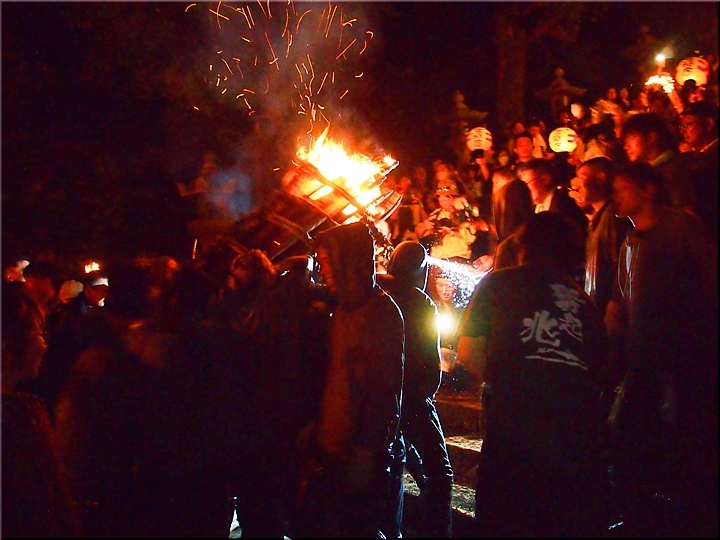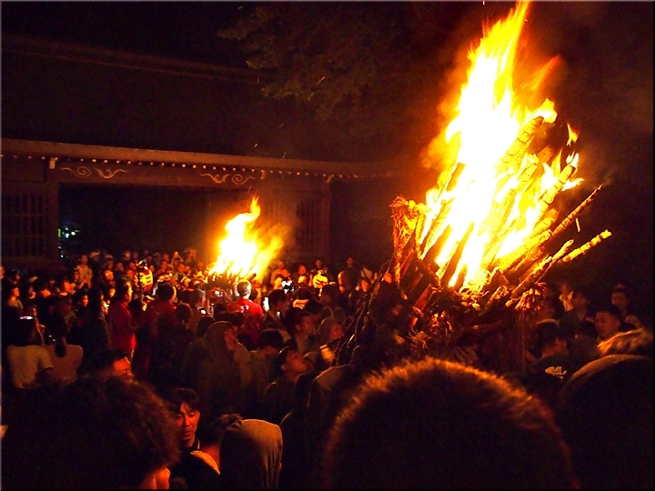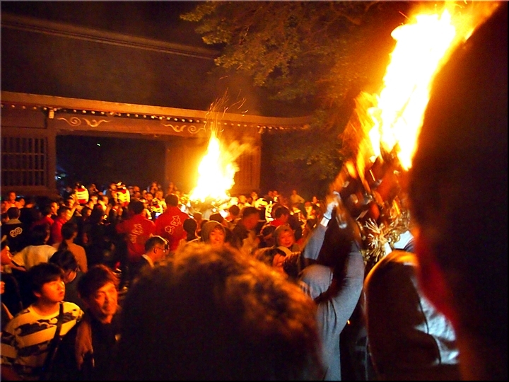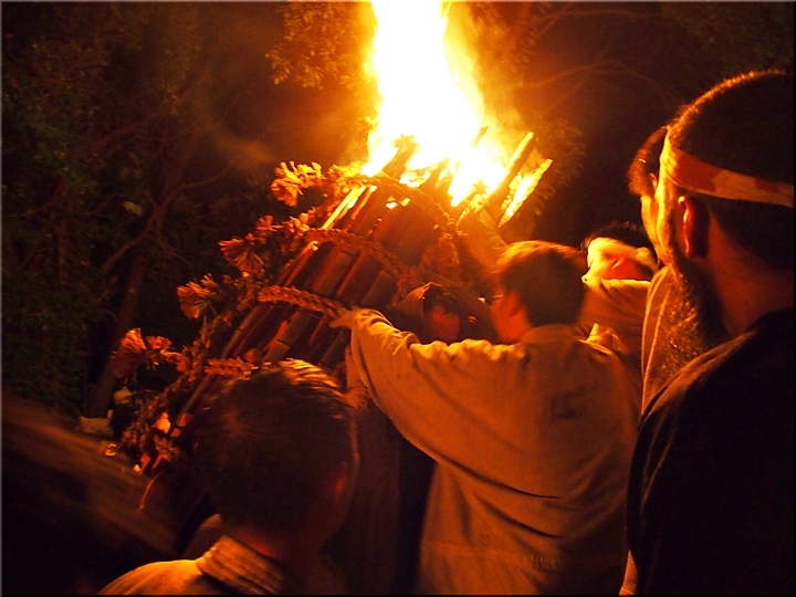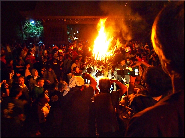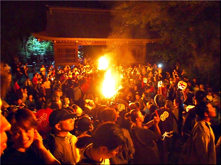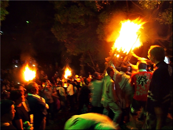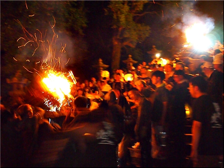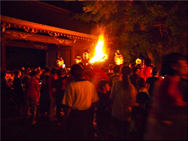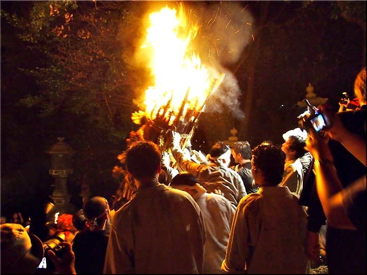 火の粉を被りながら汗だくで大松明を移動しておられます氏子の皆様にカメラを向けながら、「がんばれぇ〜」と応援しますGONsan。こぅして応援します事で、GONsanにもご利益が有るものと固く信じて、時間が許せばお手火神事≠ノ出掛けているのですけど…