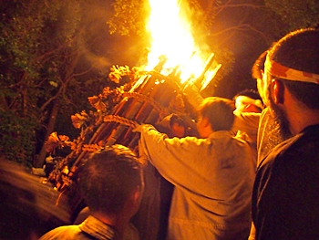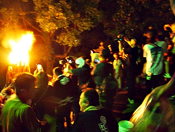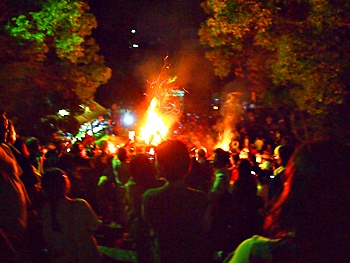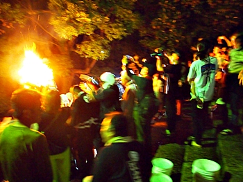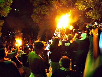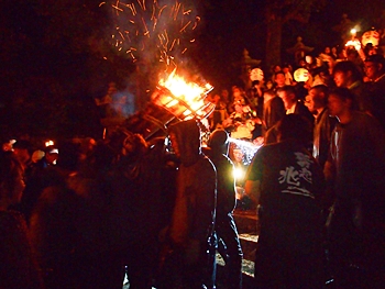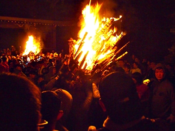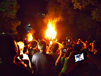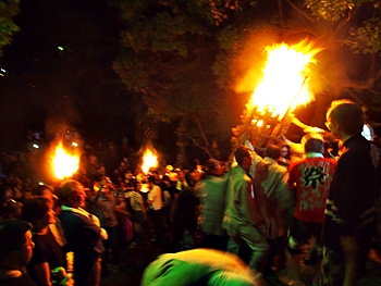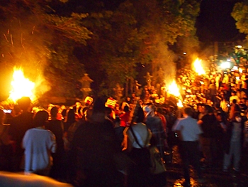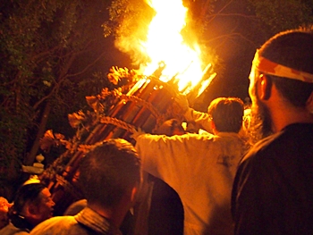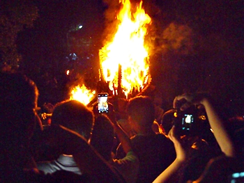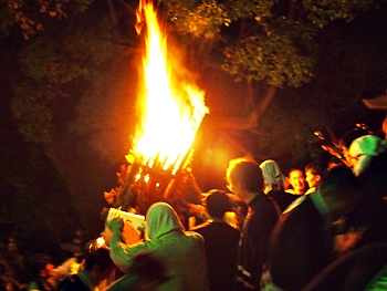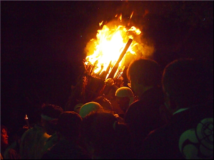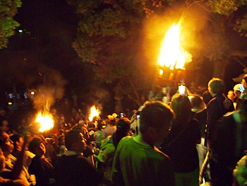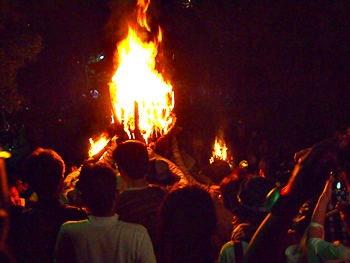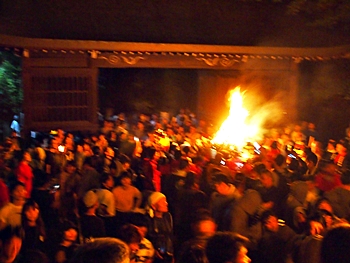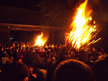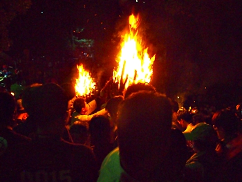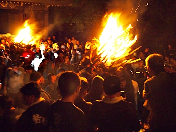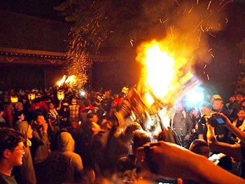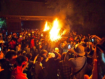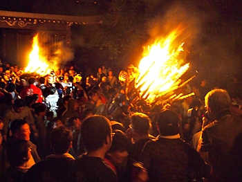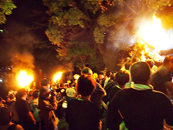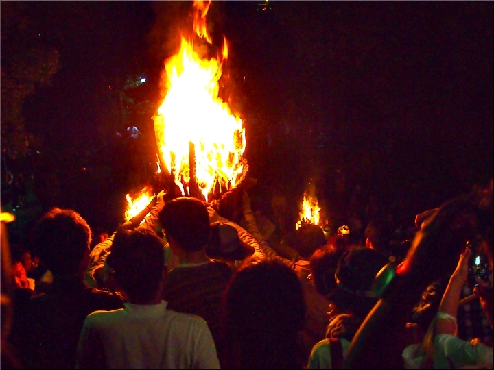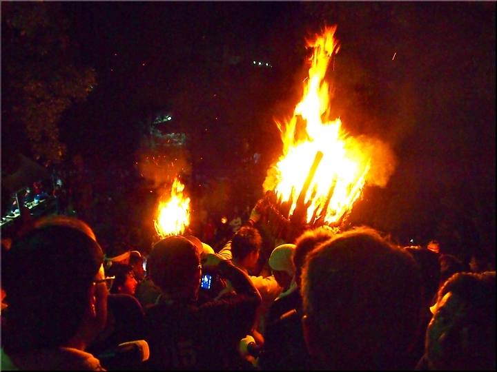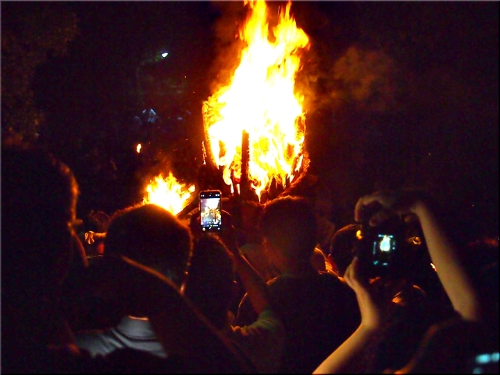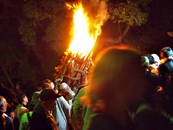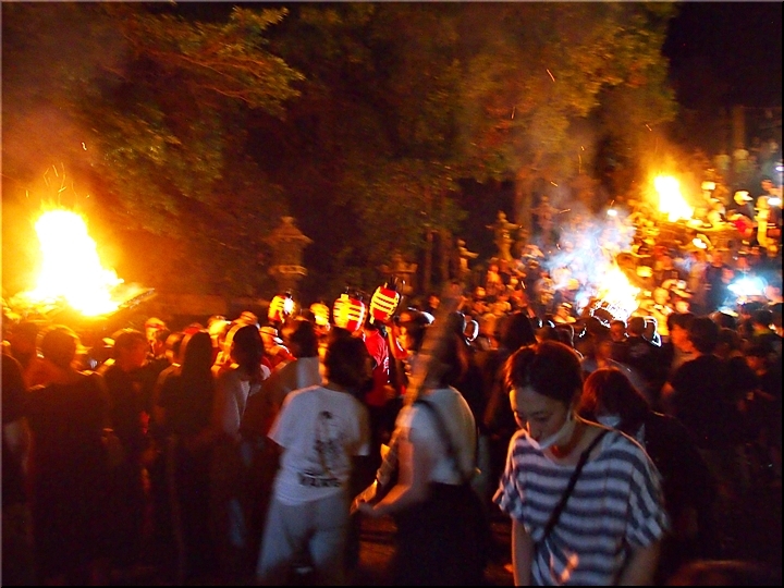 火の粉を被りながら汗だくで大松明を移動しておられます氏子の皆様にカメラを向けながら、「がんばれぇ〜」と応援しますGONsan。こぅして応援します事で、GONsanにもご利益が有るものと固く信じて、時間が許せばお手火神事≠ノ出掛けているのですけど…