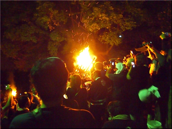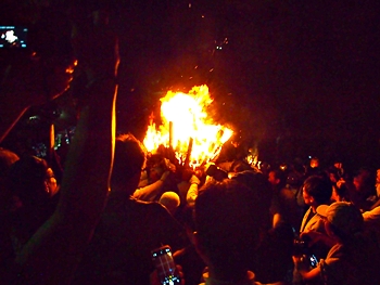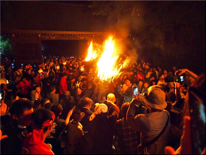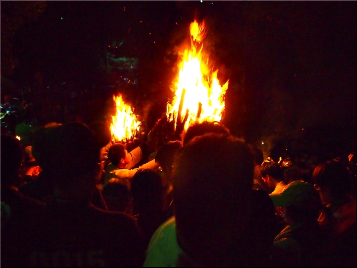 時間を確認しますと、P.M.09:54でありました。この調子では、3本凡ての大松明が本殿に奉納されますのは、やはり11:30頃になりますかも…