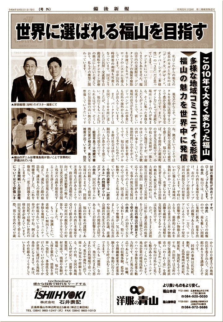 福山市や広島県と連携する中、国と地方の役割分担を説く。国民健康保険や上下水道、災害復旧などを挙げ「地方創生を進める上で国が引き取った方が効率的な仕事がある。市町村は住民サービスの知恵と工夫に集中するべきだ」と主張する。