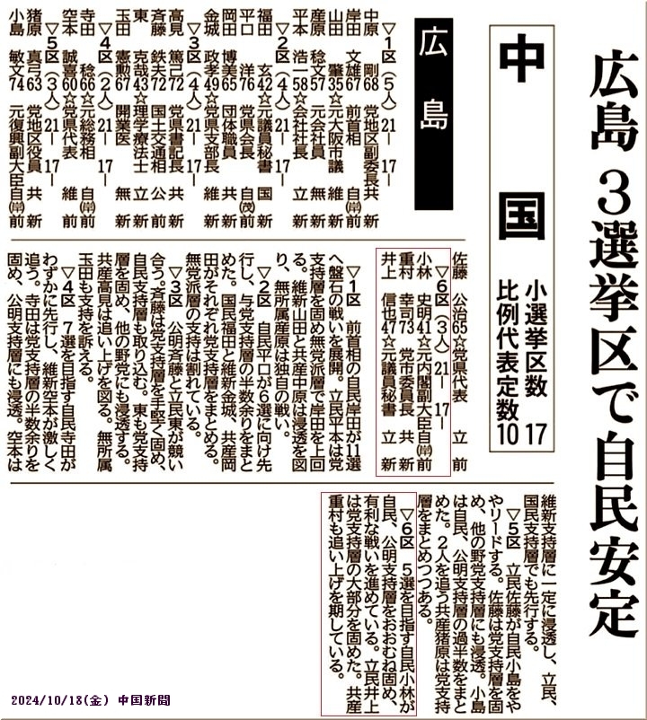 ところで、10/15に選挙戦に突入しまして、本日で4日目となりますけど、本日の中国新聞朝刊に広島県1〜6選挙区の現況の記載が…