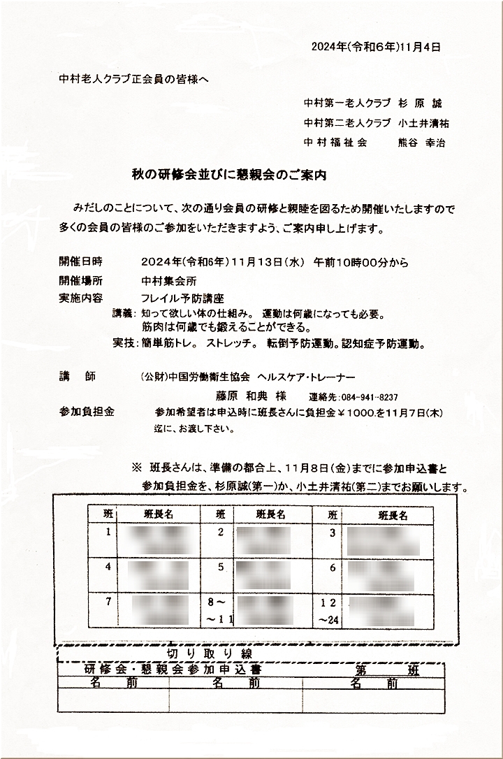 昨日、郵便受けに、中村老人クラブから秋の研修会♀J催案内の文書配布依頼が届いておりました。