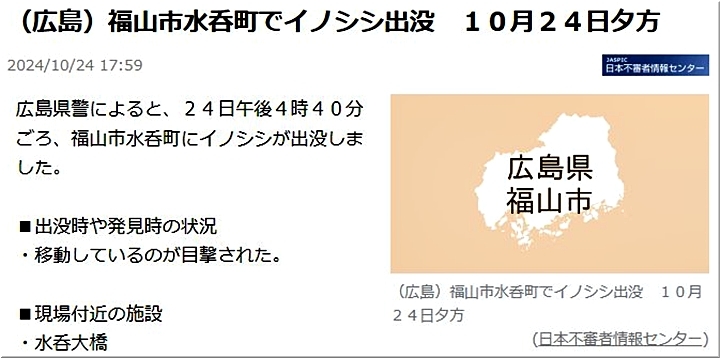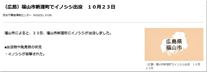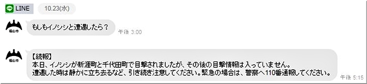 福山市からのLINEの注意喚起連絡によりますと、昨日・10/23(水)には新涯町・千代田町でイノシシの出没が目撃されましたようですねぇ〜
