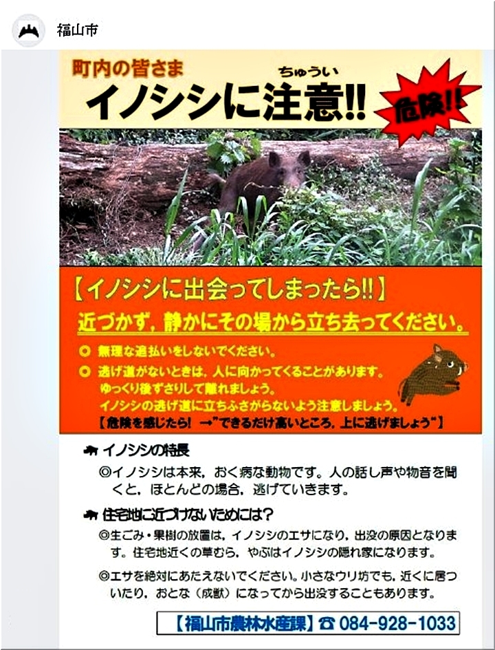 毎年、この時期になりますと、福山市街地にもイノシシ出没が恒例となりつつありますネ…