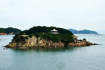 四国方向に眼を向けますと、円上島∞江ノ島≠フ後方には、うっすらと四国山地の山並みが…