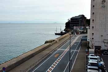 仕方なく、支所の屋上に上がり、いつものように眼の前の弁天島∞御膳山≠サして後方の仙酔島≠眺望です。何度も見慣れた景観ではありますけど、何度眼にしましても実にイィ景観であります。