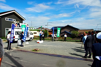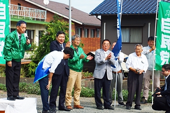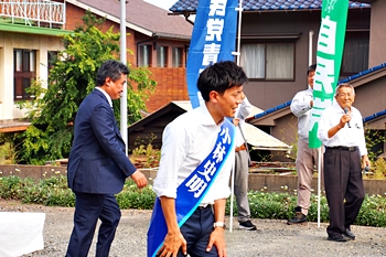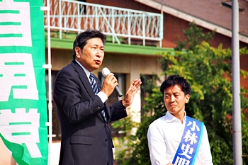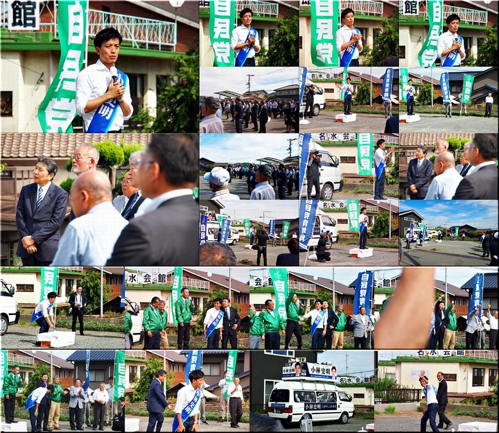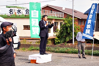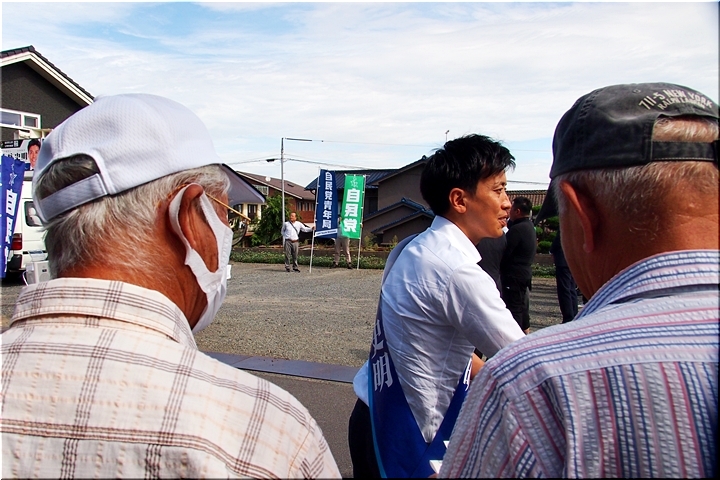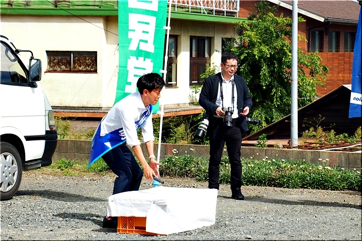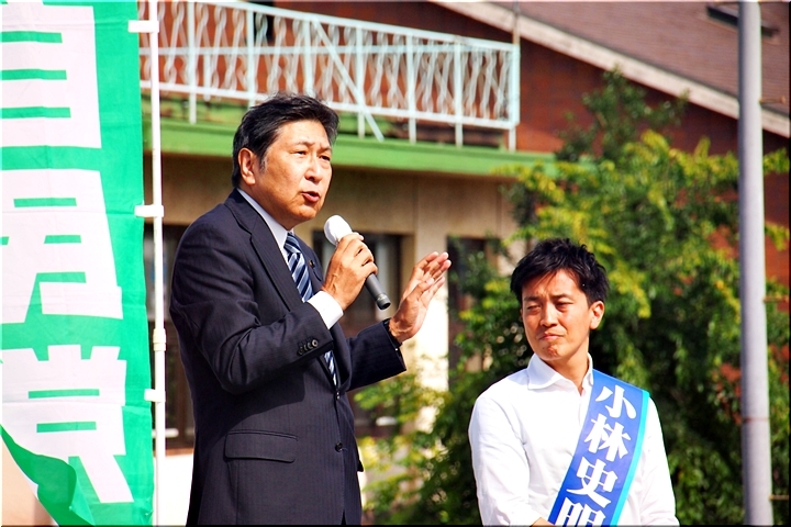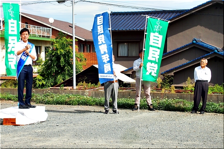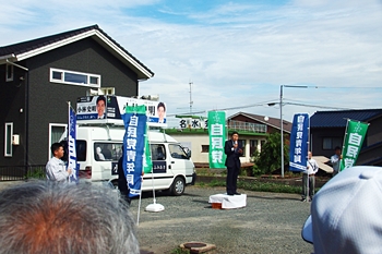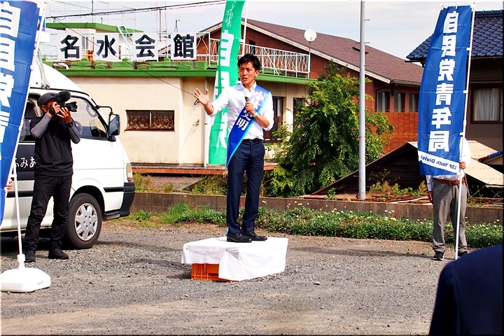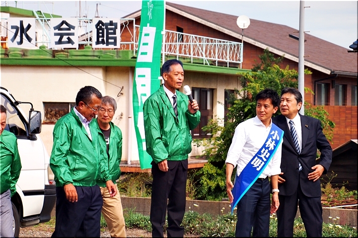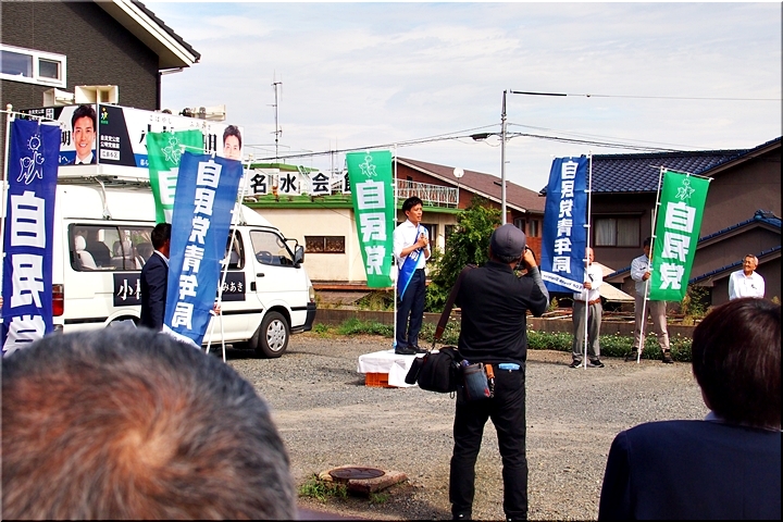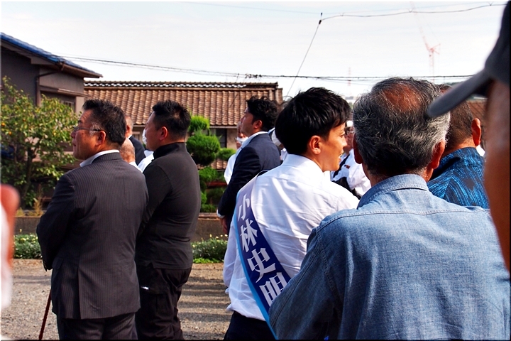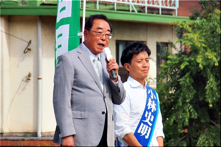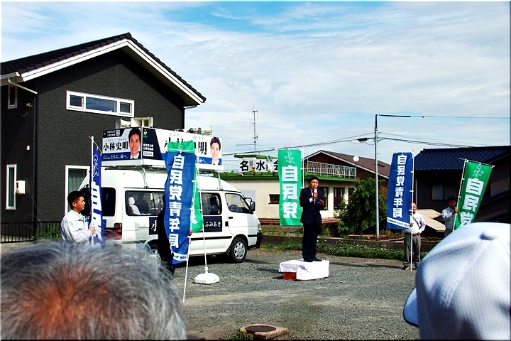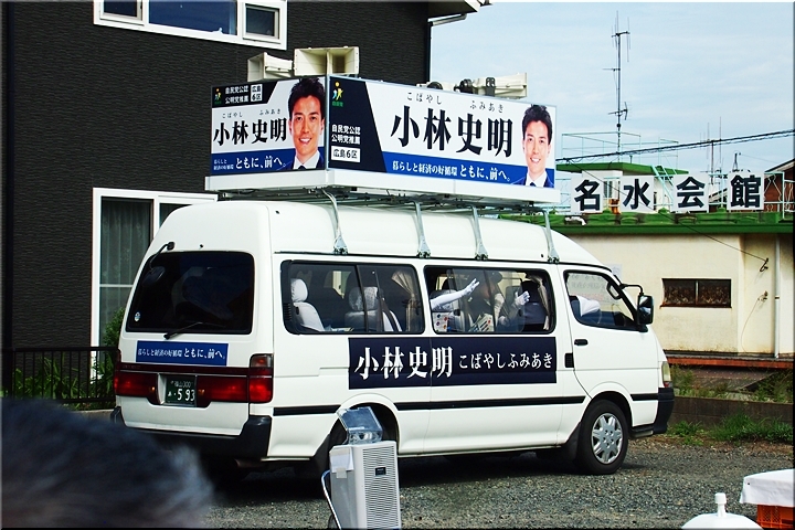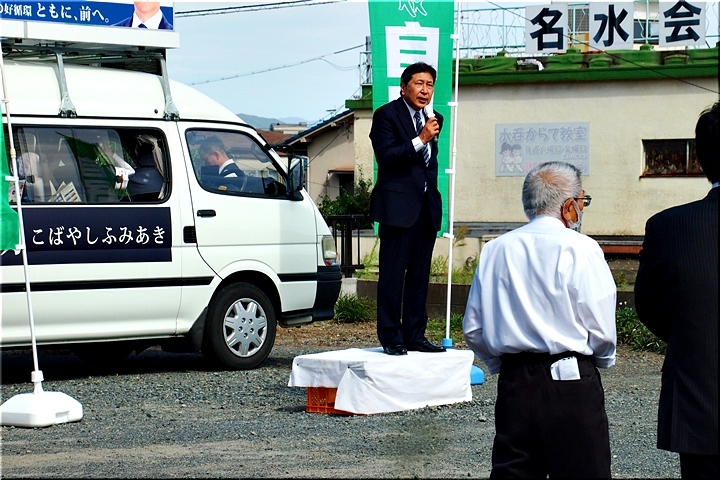 小林史明候補の選挙カーが到着と同時に、GONsanも会場にと到着です。既に皆さんお集まりで、定刻に、まずは宇田伸県議が応援演説です。