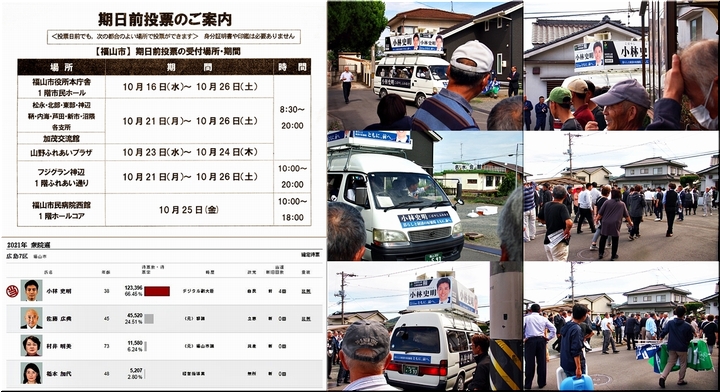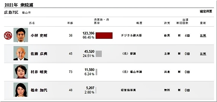 小林候補は、前回を上回ります得票となりますでしょうか…その為には、まずは投票率の引き上げが望まれますネ。それにしましても、福山市は何で投票率が低いのでしょうねぇ〜