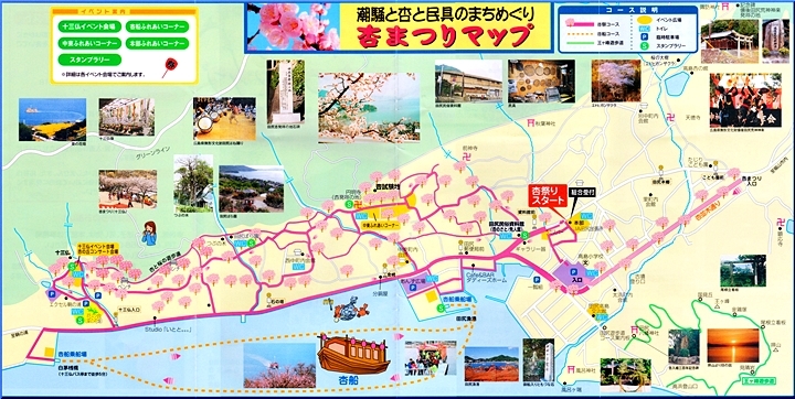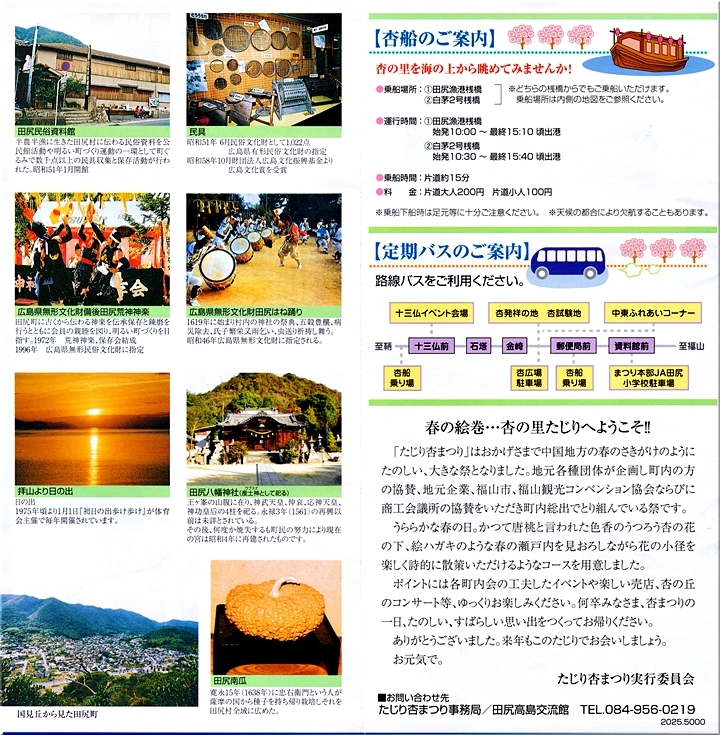 大正元年(1912)広島県農試のまとめた『芸備の園芸』には、こう紹介されている。「沼隈郡田尻村には、戸毎其宅地内及空地に数本の杏を有せざるなく、年々其産する果実を売却して、宅地租及諸雑費を補ひて尚余りあり。花時(四月上旬神武天皇祭の頃を盛とす)同村を過ぐれば恰も白雲靉靆として模糊の裡にあるが如し」と。